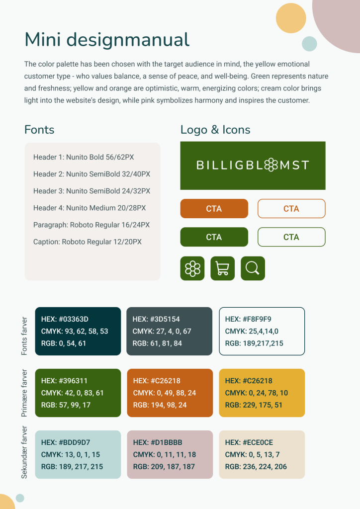 The mini designmanual includes all the elements meant to be used on the new Billigblomst website. For a consistent brand look, these specifications should also be used across other channels of communications: offline materials, social media, etc.