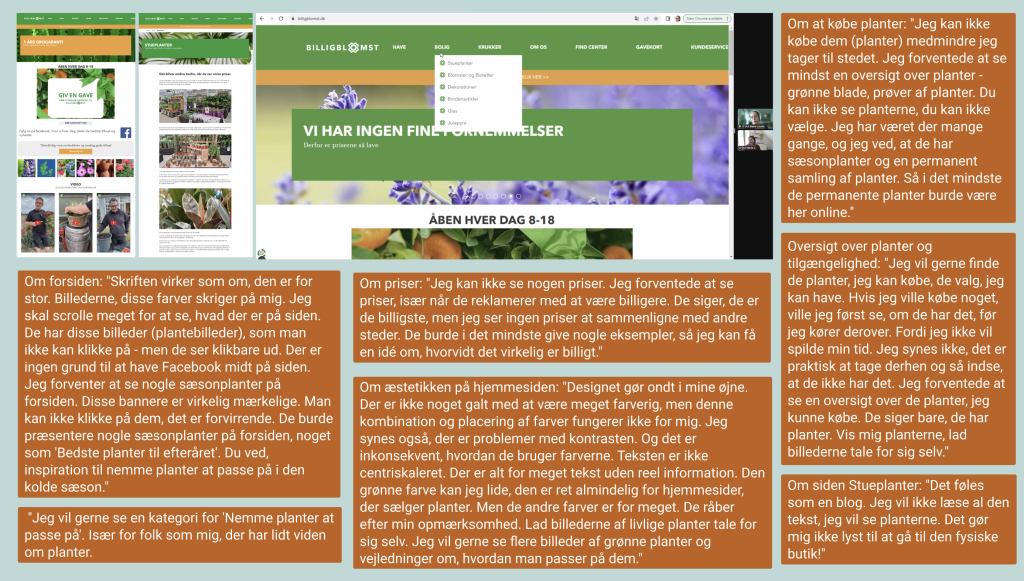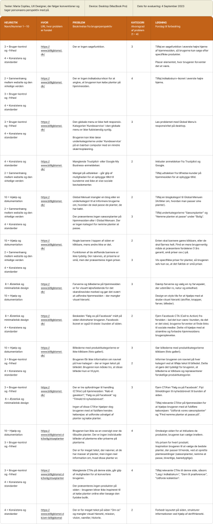 The expert evaluation aimed to identify usability issues on the Billigblomst website and uncover any missing elements in the user journey that could potentially hinder the experience for website users. I conducted this expert assessment with a focus on usability conventions while also considering the persona’s objectives.