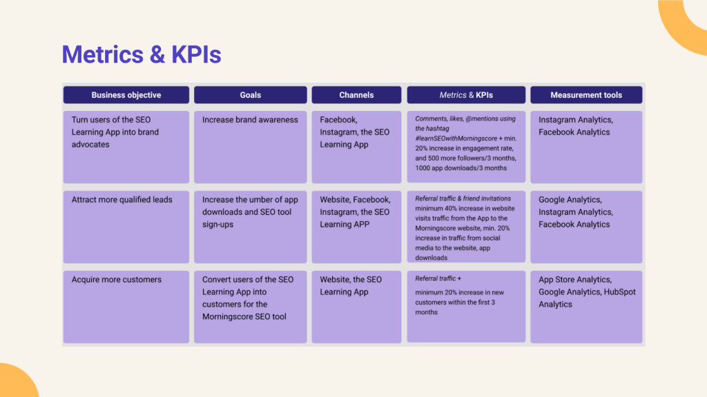 By analyzing data from these tools, Morningscore will be able to assess the impact of the SEO Learning App on brand awareness, lead generation, and customer acquisition, helping to evaluate the success of the concept in achieving its business goals.