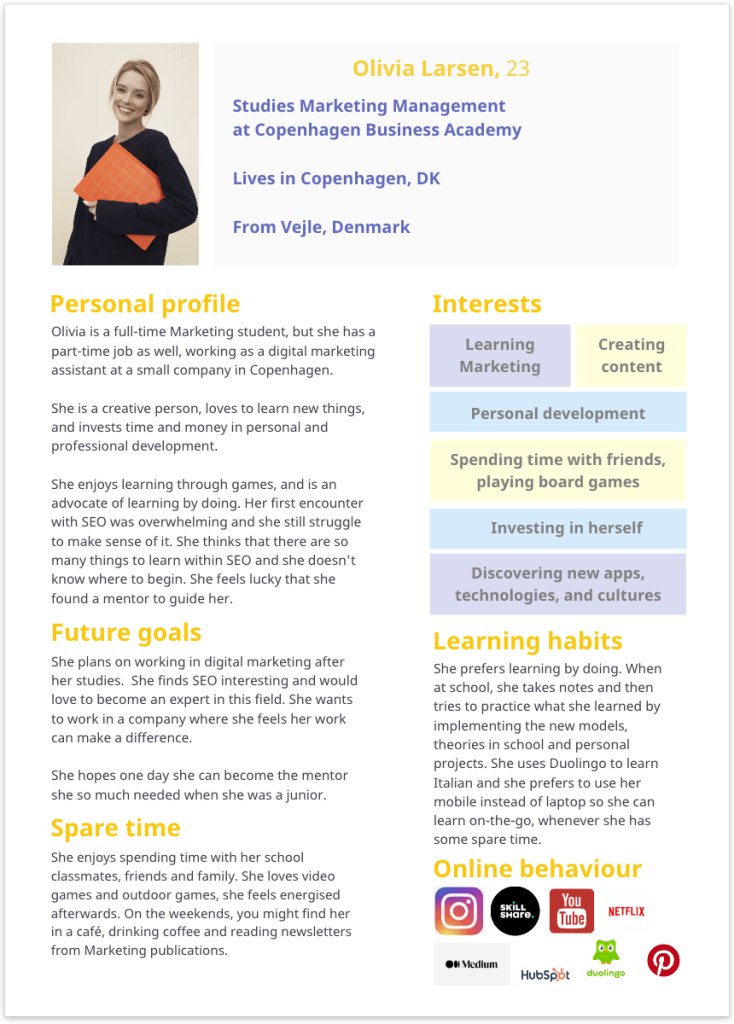 Background: Olivia Larsen is a 21 years old Marketing student, living in Copenhagen. Olivia is a creative individual with a strong desire for personal growth and development. In addition to her studies and part-time job, she invests time and resources in expanding her skill set. She enjoys socializing with friends, playing board games, and exploring new places and cultures. Olivia aspires to become an expert in the field of marketing and is committed to learning and enhancing her skills in this area.