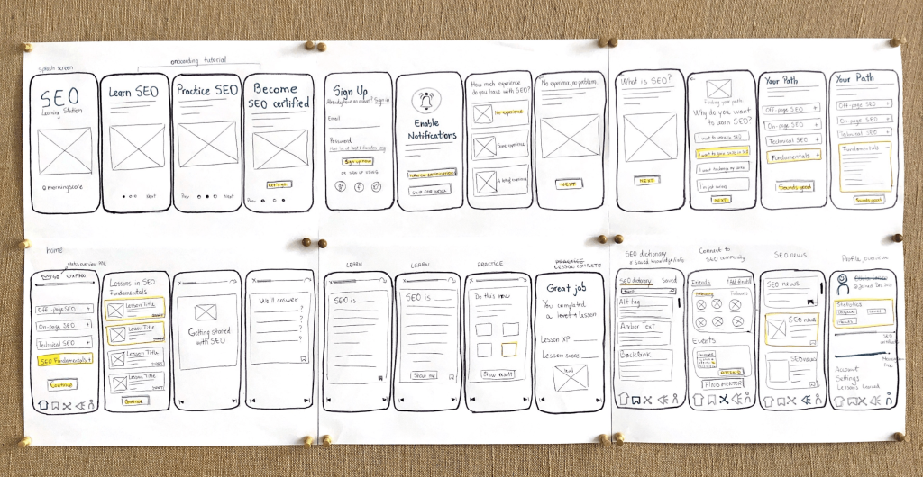 Sketching played a crucial role in the design process, serving two primary purposes: visualising the discoveries made during the Discover phase and brainstorming potential solutions to the main problem—how Morningscore can help beginners learn SEO in an engaging and effective way, ultimately converting them into customers.