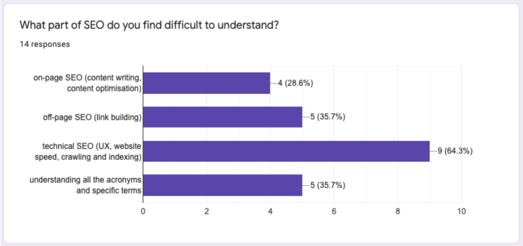In addition to HARO and in-depth interviews, a survey was conducted to gauge newbies’ understanding of Search Engine Optimization and identify challenging SEO practices.