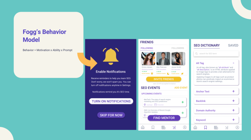 - Be Triggered: Users will be prompted and reminded to take action and learn through push notifications, serving as triggers. Moreover, users will be assured that anyone, regardless of their prior experience, can learn SEO (facilitator as a trigger).