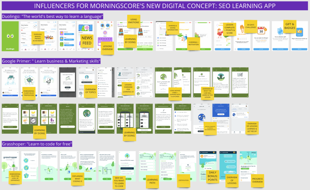 Inspired by successful apps like Duolingo, Google Primer, and Grasshopper, the Morningscore learning app leverages gamification for effective learning, analyzed for their gamification elements, information presentation, onboarding process, and user engagement strategies.