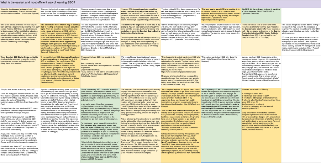 Interviews were conducted with 76 marketing professionals and SEO experts via the HARO platform (Help a Reporter Out). The aim was to glean insights on the most effective approach to learning search engine optimization.