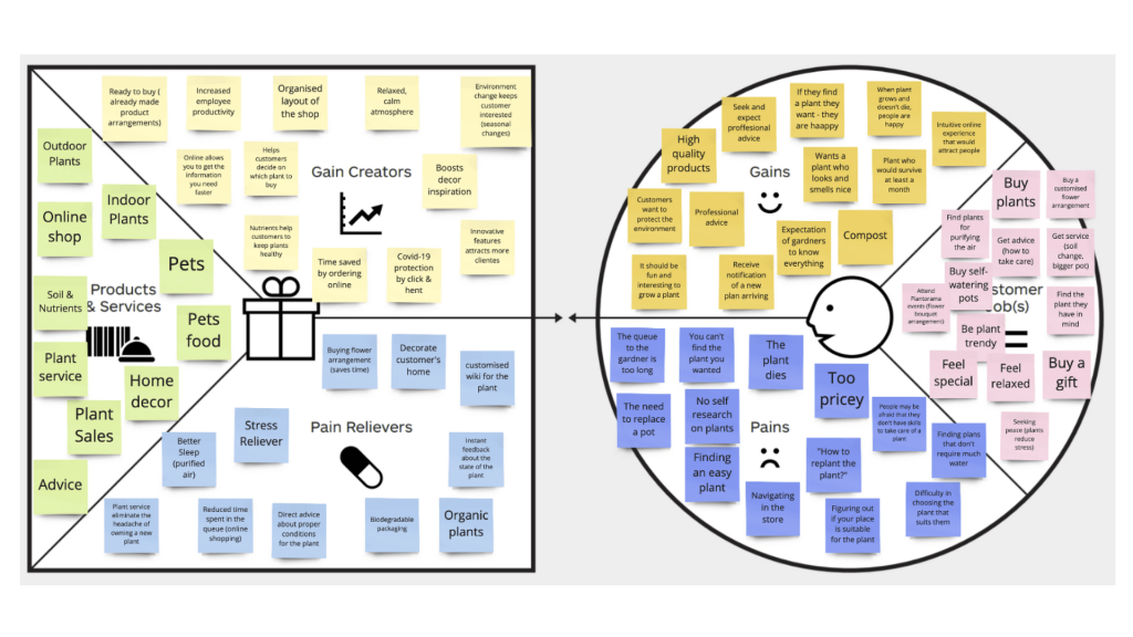 Value Proposition Canvas was used to analyze what Plantorama offers to its customers, to see how their pains could be relieved, and to brainstorm on how the proposed digital concept could help